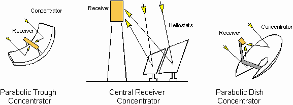 When higher temperatures are required, concentrating solar collectors are used. Solar energy falling on a large reflective surface is reflected onto a smaller area before it is converted into heat. This is done so that the surface absorbing the concentrated energy is smaller than the surface capturing the energy and therefore can attain higher temperatures before heat loss due to radiation and convection wastes the energy that has been collected. Most concentrating collectors can only concentrate the parallel insolation coming directly from the sun's disk (beam normal insolation), and must follow (track) the sun's path across the sky. Four types of solar concentrators are in common use; parabolic troughs (as used in the Kramer Junction, California solar energy electricity generating plant shown in Figure 1.1), parabolic dishes, central receivers and Fresnel lenses. Figure 1.9 shows these concepts schematically.