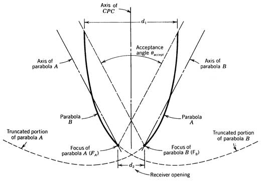 Also discussed here is an interesting type of concentrator called a compound parabolic concentrator (CPC). This is a non-imaging concentrator that concentrates light rays that are not necessarily parallel nor aligned with the axis of the concentrator.